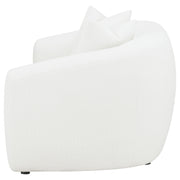 Invite cozy sophistication into your home with this elegantly contoured loveseat, upholstered in soft faux sheepskin boucle fabric. Its curved silhouette and sloped armrests create a smooth, cloud-like form that exudes modern charm. A single plush seat cushion offers comfortable support, while matching faux down-filled accent pillows add refined warmth. Supported by black legs for a hint of contrast, this loveseat blends contemporary elegance with inviting texture, perfect for modern and transitional interiors._x005F_x000D_ Key Features: • Curved loveseat upholstered in natural faux sheepskin boucle fabric • Graceful sloped arms and smooth contours showcase modern tailoring • Plush single seat cushion delivers comfort and lasting resilience • Tight back design keeps its refined and structured appearance • Includes accent pillows with faux down fill for added softness • Black legs contrast beautifully with the light neutral upholstery