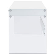 With its cool, contemporary appeal, this versatile writing desk works well in a bedroom or living room. It creates a functional space to work and study without sacrificing style. Bold, thick, tempered glass panels form its base supports, giving it an inspired touch of glamour. Its striking aesthetic is brought to life with a finish of glossy white. This desk is complete with an open center compartment and two drawers, adding extra convenience while maintaining its sleek look. Key Features: • Contemporary writing desk with clear glass side panels and white top • Two drawers and one center cubby provide storage and function • High gloss engineered wood top adds a polished modern appearance • Tempered glass legs give the desk a floating visual effect • Sleek chrome-finished knobs complement the clean white design • Ideal for minimalist bedrooms, living rooms, or compact offices