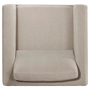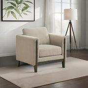 Clean lines and cozy form unite in this upholstered accent chair, a refined piece grounded in simplicity. Framed in engineered wood with a rich coffee finish, its recessed panel arms and low profile evoke modern structure. Soft taupe polyester wraps plush, reversible cushions that offer lasting comfort and flexibility. Designed to coordinate with matching pieces or stand confidently on its own. Key Features: • Accent chair with panel arms and coffee frame delivers a structured, contemporary look • Warm coffee wood frame adds contrast and natural refinement to the design • Soft taupe polyester upholstery offers durability with an inviting texture • Recessed panel arms enhance the architectural silhouette of the chair • Reversible seat and back cushions maintain shape and extend usability • Constructed from engineered wood, fabric, and foam for support and everyday comfort