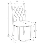 Blending timeless elegance with plush comfort, this side chair enhances any dining space. Its high backrest features a classic button-tufted design, adding depth and sophistication. A rolled top and hand-applied nailhead trim create refined detailing, while the generously padded seat ensures lasting comfort. Supported by sturdy, tapered legs, this chair is built for both beauty and durability. Whether part of a formal setting or an inviting everyday dining space, it brings grace and charm to the table. Key Features: • Side chair with a button-tufted high back and elegant rolled top • Soft beige linen-like fabric upholstery enhances classic appeal • Nailhead trim adds refined detailing to the chair’s silhouette • Espresso finished tapered legs provide strength and stability • Generously padded seat ensures superior dining comfort • Timeless design complements traditional and transitional spaces