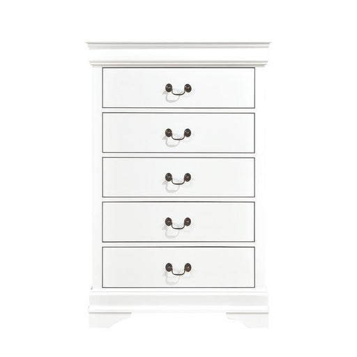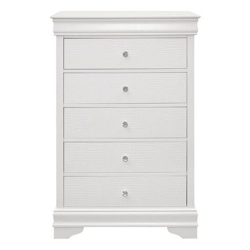 Homelegance (Fremont Warehouse)Lucida Collection by Homelegance White finish Made of manmade wood Bead molding Shell motif 5 Drawers Dovetail drawers Metal on metal center glide...