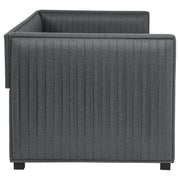A gray fabric, pleated and overlapping along the surface of this twin daybed and trundle set, create a textured appearance against the clean straight lines. The narrow arms and backrest invite you to get creative with your own accent pillows and throws, opening this furniture piece up to becoming a lounge sofa or a bed for additional overnight guests. A trundle slips beneath the main frame when not in use or can be retrieved and glided out effortlessly. Black finish feet add slight elevation and a pop of contrast against flooring and rugs too. This twin daybed trundle set is the perfect addition for compact, multipurpose spaces like home offices and guestrooms. Key Features: • With its thin, pleated, fabric details, this shelter back daybed features exceptional tailoring throughout • Relax in comfort with this sleeping, lounging, daybed must-have • Perfect for smaller living areas, convenient pull out trundle for extra sleeping space when needed • Upholstered in grey fabric • Frame constructed with pine and MDF • Slat kits included