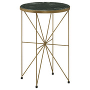 A stunning blend of contemporary elegance and classic sophistication, this round accent table adds a luxurious touch to any space. Featuring a solid green marble tabletop, inset within a warm antique gold-finished metal frame, this piece exudes refined glamour. The slim, geometric base creates an open, airy silhouette, making it perfect for compact spaces. Delicate teardrop-shaped feet with protective caps provide stability while adding a subtle decorative element. Ideal for modern, glam, and transitional interiors, this table serves as a stylish surface for décor, drinks, or statement pieces. Key Features: • Solid green marble tabletop for a touch of timeless luxury • Warm antique gold-finished metal base enhances its elegant appeal • Open, airy geometric design creates a visually light aesthetic • Compact size makes it perfect for small spaces and accent areas • Teardrop-shaped feet with protective caps add subtle detail and stability • Versatile styling complements modern, glam, and transitional interiors
