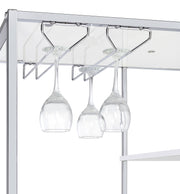 A modular design with integrated LED lighting offers a fresh, modern look, perfect for hosting guests in your contemporary setting. This wine cabinet features a minimalist and linear design with four open shelves, a convenient pull-out drawer, two tiers of wine bottle storage, and integrated stemware racks. Constructed from engineered wood in a white high-gloss, scratch-resistant finish, it is complemented by a sleek silver-finished rectangular frame. Combining style and functionality, it’s an ideal choice for serving and entertaining. Key Features: • Modular wine cabinet with LED lighting and four open shelves • Engineered wood in a white high-gloss, scratch-resistant finish • Sleek chrome finished rectangular frame for a modern aesthetic_x005F_x000D_ • Single pull-out drawer for added storage convenience • Two tiers of wine bottle storage for efficient organization • Integrated stemware racks keep glassware easily accessible