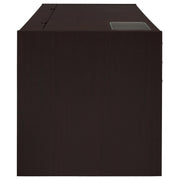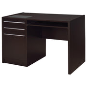 A modular design scheme adds function and personality to a modern task space. This connect-it computer desk conquers basic operations and lends a stylish contemporary look. Finished in bold cappuccino, its linear silver hardware pulls offer a cool touch. Find storage space in three side drawers with Euro glides and a center keyboard drawer that makes computing a snap. Spruce up a compact contemporary office or home space with this exceptional desk. Key Features: • Connect-It office desk in cappuccino finish • Lift-top cord management compartment, a keyboard tray, two (2) storage drawers, and one (1) file cabinet are features of this desk • Clear tempered glass insert on desk offers clear view of devices • Lift-top storage contains power outlet (4AC) • MDF, particle board, and laminate construction