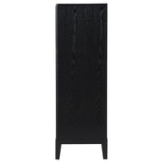 Add abundant clothing and accessory storage in a stylish bedroom with this modern five-drawer chest. Its compact profile fits virtually anywhere, while a chic look is created with fluted drawer fronts that add impressive dimensionality. A black finish imparts sophistication, while wire brushing creates a subtle sense of texture and depth. Each drawer front is adorned with a half-moon handle in a soft golden metallic finish that adds a perfect hint of warmth. The top drawer of the chest adds felt lining, perfect for protecting delicate items. Key Features: • Stylish and modern, a contemporary wood chest features a wire brushed black finish • Fluted texturing highlights five drawer fronts to provide sophisticated dimensionality • Drawers feature demi-lune metal handles in a warm golden tone for sophisticated contrast • Top drawer includes felt lining in matching black, offering easy protection to delicate items • Tapering legs complete the look while offering stability and support • Drawers feature English dovetail joinery for excellent craftsmanship