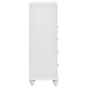 Bring sparkling sophistication to your bedroom with this five-drawer chest. The top drawer is accented with glittery acrylic panels that shimmer against the crisp white finish, while faceted crystal hardware adds a glamorous finishing touch. Sculpted bun feet introduce a classic detail that balances the modern design. Built with a sturdy frame of solid rubberwood and engineered wood with okume veneer, this chest offers durability along with generous storage space for everyday essentials._x000D_ Key Features: • White chest with five drawers and sparkling decorative panel accents • Top drawer includes glittery acrylic paneling for shimmering dimension • Faceted crystal hardware adds a glamorous sparkle to each drawer front • Generous storage capacity keeps clothing and essentials neatly organized • Frame is built with solid rubberwood, engineered wood, and okume veneer • Classic bun feet complete the design with elegant and timeless character