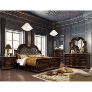 The bold look of this collection boasts an elegantly traditional design. A tall camelback headboard with button tufted leatherette upholstery is in the perfect contrast to the sleigh style footboard. Matching case goods feature genuine marble tops, felt-lined top drawers and full extension metal glides.