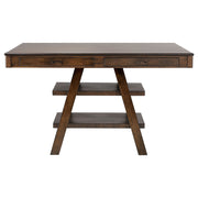 Entertain at this transitional counter height dining table, featuring ample seating space for up to six guests or family members. A rich walnut finish offers a neutral color palette and bold look to this furniture piece. With a raised counter height top, this table offers plenty of storage space below for all your dining essentials, from bowls to plates to serving pieces. Tucked inside the tabletop are two drawers for keeping linens and silverware. Use the A-frame pedestal base shelves for decor, cookbooks and more to create a custom look. Key Features: • A coastal transitional style for today’s casual dining room in a counter height offer • Table is made of solid hardwood and walnut veneer • Table comes with two tinted drawers on one length side for linen or silverware storage • Table has two open shelves for easy access storage