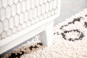 This two-door cabinet adds subtle charm with its crisp white finish and sculpted geometric door fronts. The raised honeycomb-inspired texture brings dimension and interest to the façade, while lightly distressed edging offers a softly weathered touch. Inside, an adjustable shelf allows for flexible storage. Its clean lines and sculptural surface make this cabinet an ideal accent for transitional, coastal, or eclectic interiors. Key Features: • Two-door cabinet with sculpted geometric fronts for textured visual appeal • Raised honeycomb-inspired surface adds sculptural dimension to the design • White painted finish with light distressing for a softened, weathered look • One adjustable interior shelf accommodates varying storage needs • Clean silhouette works across coastal, transitional, and eclectic styles • Crafted from durable materials for everyday storage and display needs