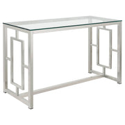 This rectangular console table combines modern design with functional versatility, making it an ideal piece for your living room or hallway. The tempered glass top ensures durability, while the electroplated chrome frame provides a sleek, polished finish. The open geometric base enhances both the table’s aesthetic and its structural support. Crafted with sturdy metal construction, this console table serves as a perfect display surface or functional storage solution. Key Features: • Rectangular console table with clear tempered glass top • Electroplated chrome frame with sleek, polished reflective finish • Clear tempered glass provides durability and modern elegance • Open geometric base offers structural support and visual appeal • Sturdy metal construction ensures long-lasting use and stability • Versatile design perfect for displaying decor or functional use