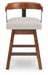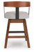 Made with select acacia veneers and hardwood solids. Gently distressed and burnished dark brown finish. D594-35 has a planked table design with thick-look tops and butterfly leaf. Seat covers in brown faux leather. Server features a working drawer along with 2 doors and wine storage. D594-42 table has storage base and removable leaf.