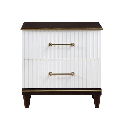 Tasked with executing a design that encompasses the trademarks of contemporary design while including hints at a glamorous lifestyle, the Niles Collection perfects the look. Brushed gold-tone knob and bar hardware radiate from the two-tone white and cherry finish of the collection, the dramatic combination creating an elegant statement of design perfection. Routed panels front the dresser while gold-finished trim further accents the piece. 66 x 18 x 38.5H