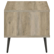 All the best elements of a retro design motif go modern in your updated living space. This wood end table fits beautifully in an easy-living family room or living room, or even as a casual bedroom nightstand. A square silhouette is tasteful and unusual, constructed of distressed pine finish engineered wood and rubberwood. A deep gray interior shelf separates space perfectly, leaving room for both tall and small items. Tapered rounded legs match its shelf, adding a nod to retro influence. Key Features: • End table with distressed pine wood-look finish and engineered wood construction • Black powder-coated metal legs offer stability and a modern aesthetic • Dual open shelves provide ample storage and easy access to items • Black shelf adds contrast and enhances the table’s modern appeal • Scratch-resistant laminate veneer ensures long-lasting durability • Simple, contemporary design complements any living room or bedroom setup