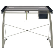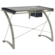 Contemporary attitude shines positive light on this fabulous drafting desk. With curves and linear elements, it creates an enticing look. Enjoy luscious champagne finish steel and a smoke tempered glass top. Find space to stash essentials in a pencil ledge, three drawers, and a variety of storage compartments. This elegant, versatile desk brings a light, airy flavor to a home or business office. Key Features: • Drafting table with adjustable smoked glass top and silver metal frame • Curved metal legs and crossbars enhance structural stability • Includes retractable pencil ledge, three drawers, and storage trays • Tempered glass surface supports drawing, tracing, and design work • Plastic drawer stack adds organizational utility beneath the desk • Perfect for creative spaces, art studios, or multi-functional use