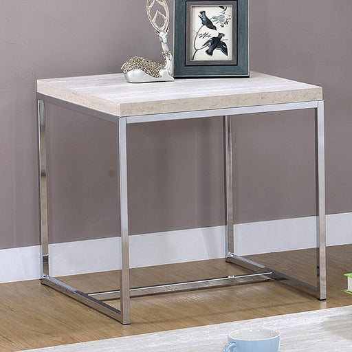 FOA WestNinove I White/Chrome End Table, 23 1/2"L X 23 1/2"W X 22"H, 53.5lbs. This contemporary set of living room tables has a unique curled shelving desi...