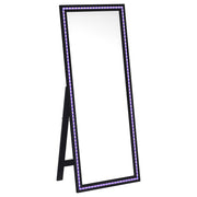 Dress up a dressing area or seating group with the glamour of a modern floor mirror. The full length design features a decorative frame complete with a support leg or its freestanding, perfect for defining an open living space or offering dimension elsewhere in your home. The mirror includes LED lighting, creating an inviting ambiance while providing light perfect for selecting jewelry or choosing your outfit. It features a neutral finish with silver trim that gleams in the light, creating a sense of depth and dimension. Choose the perfect spot for this freestanding floor mirror. Key Features: • Modern floor mirror adds a glamorous touch for a sophisticated master suite or chic living area • A-frame stand allows the mirror to float within your space without requiring a wall to lean against • Silver finish accent trim creates depth and contrast in both texture and color • Neutral finish complements in virtually any setting • LED strip lighting operated with a with an easy, convenient touch switch