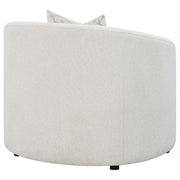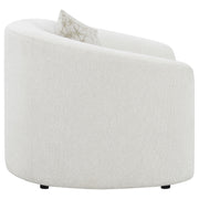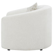 This boucle accent chair adds warmth and sculptural charm to any living space. Upholstered in soft latte boucle fabric, it features an elegant curved silhouette with sloped armrests and a smooth tight back for a clean, tailored appearance. A plush seat cushion provides superior comfort, while the included accent pillow with faux down fill enhances coziness and sophistication. Perfect for reading nooks, lounges, or living rooms, this chair combines timeless texture with modern mid-century flair._x005F_x000D_ Key Features: • Accent chair wrapped in soft latte boucle upholstery for texture • Curved silhouette with sloped armrests adds gentle modern contour • Plush seat cushion delivers long-lasting comfort and relaxation • Tight back design keeps a smooth, well-tailored appearance • Accent pillow with faux down fill provides cozy decorative touch • Perfect for reading corners, lounges, or stylish living spaces