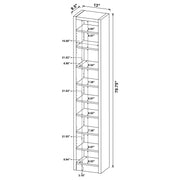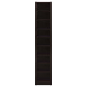 Maximize storage without sacrificing style with this tall, narrow bookcase in a deep cappuccino finish. Designed with a compact footprint, it features nine shelves—six of which are adjustable—to easily accommodate books, décor, or office supplies. Crafted from engineered wood and finished in a durable melamine veneer, this sleek bookcase adds a modern touch to any living room, bedroom, or home office. Key Features: • Contemporary bookcase with tall, space-saving vertical design • Deep cappuccino finish adds richness to modern and transitional interiors • Two fixed and six adjustable shelves provide flexible storage solutions • Slim profile fits easily into tight spaces or small rooms • Constructed from engineered wood with a scratch-resistant melamine veneer • Ideal for organizing books, framed photos, and personal accessories