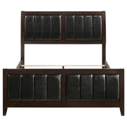 A timeless centerpiece, this panel bed blends mid-century inspiration with modern sophistication. Crafted with clean lines and a bold silhouette, it showcases a rich cappuccino wood finish for warmth and depth. The headboard and footboard feature black padded leatherette panels with vertical channel detailing, offering both comfort and refined texture. Constructed from rubberwood, veneer, and engineered wood, this bed delivers enduring strength and style that enhances any bedroom retreat._x005F_x000D_ Key Features: • Queen panel bed with bold profile and mid-century modern flair • Rich cappuccino wood finish complements black padded upholstery • Headboard and footboard feature vertical channel stitch detailing • Leatherette surface adds soft texture and easy-care durability • Crafted from engineered wood, rubberwood, and okume veneer • Creates a refined focal point for any master or guest bedroom