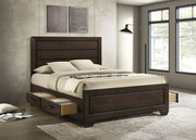 Indulge in a love of basic nature. Fresh, inspiring aesthetics combine to make this bed a great choice for a transitional room. Linear design elements create optically pleasing balance while a washed taupe finish results from a gorgeous patina in greyish-brown. Side storage increases utility. This bed serves beautifully through a series of room redesigns. Key Features: • Storage panel bed with bold rectangular framing and a streamlined silhouette • Washed taupe finish highlights wood grain texture with contrasting black grooves • Includes dual drawers on each side rail for concealed underbed storage • Recessed panel headboard offers visual depth and structured design • No foundation required thanks to supportive slatted base construction • Engineered wood build with durable laminate veneer and framed case detailing