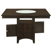 This counter height dining table brings striking form and smart utility to modern dining spaces. A frosted glass lazy Susan crowns the square tabletop, offering effortless access for shared meals and conversation. Below, the pedestal base conceals ample storage with a built-in wine rack and stemware holder. Crafted from rubberwood, engineered wood, and okume veneer, it blends durability with elegant presence—perfect for casual entertaining. Key Features: • "Square counter height table with built-in lazy Susan for shared serving convenience • Cappuccino wood finish complements the modern grid-panel base with warm elegance_x005F_x000D_ • Rotating frosted glass centerpiece enhances function and visual sophistication_x005F_x000D_ • Integrated cabinet with wine rack and stemware holders keeps essentials close_x005F_x000D_ • Made from rubberwood, engineered wood, and okume veneer for durability_x005F_x000D_ • Ideal for stylish kitchens or dining rooms seeking smart storage and charm
