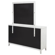 Introduce fresh style and inviting texture with a modern six-drawer dresser and framed mirror. It shows off a distressed white finish over wood grain texture, offering an inviting look and feel in your living room. Each drawer front features layered trim that creates depth and is augmented with a long bar pull in antique brass finish to create contrast. The mirror on top features a squares silhouette with layered trim that matches drawer fronts. Tapered legs complete the look and a tip over restraint is included to add safety in your bedroom. Key Features: • A modern six-drawer dresser with a framed mirror offers a clean-lined silhouette and lots of storage • Distressed white finish highlights wood grain details and bar hardware to create texture and depth • Dresser includes six drawers of equal size, perfect for clothing, accessories and even linens • Tip over restraints are included to add safety and peace of mind to this stylish set